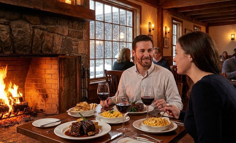 - The Vibe: Dark wood, low ceilings, and a roaring fire that warms the entire dining room.